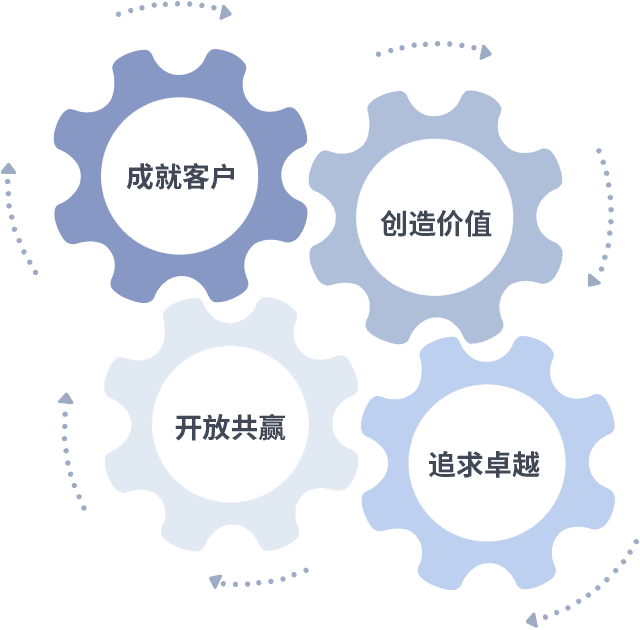 成就客户是一切决策的出发点,,创造价值是衡量所有工作的标准,,,,追求卓越是我们做事做人的态度,,,,开放共赢是我们的格局也是最终的结果。。价值观的齿轮环环相扣,,,,推动着组织里的每个人不断向前。。